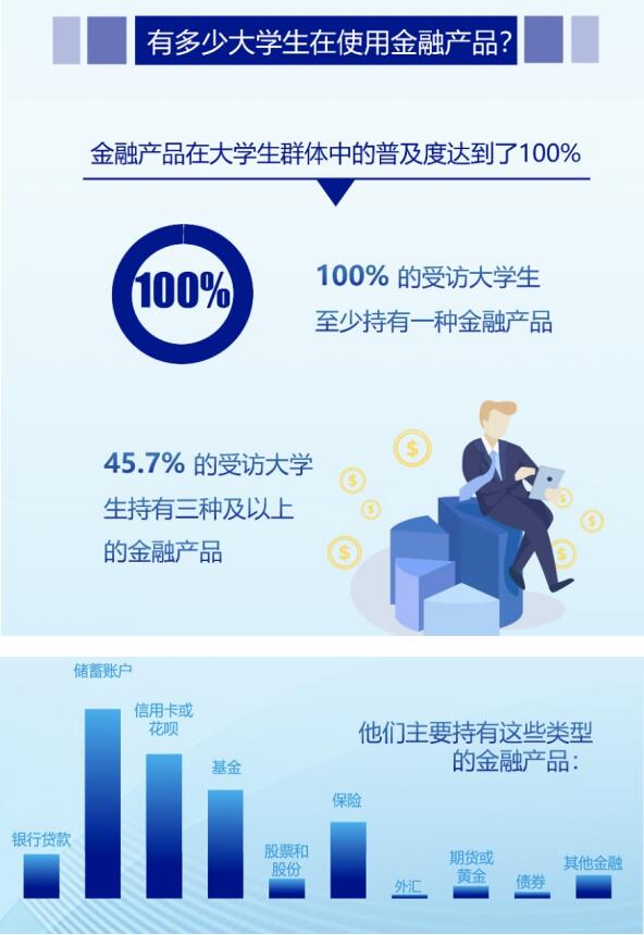 《藍皮書》還發現,目前金融產品在大學生群體中的普及度達到100%,有45.7%的受訪大學生持有3種及以上的金融產品,持有最多的金融產品類型分別是儲蓄賬戶、信用卡(或花唄)和基金。