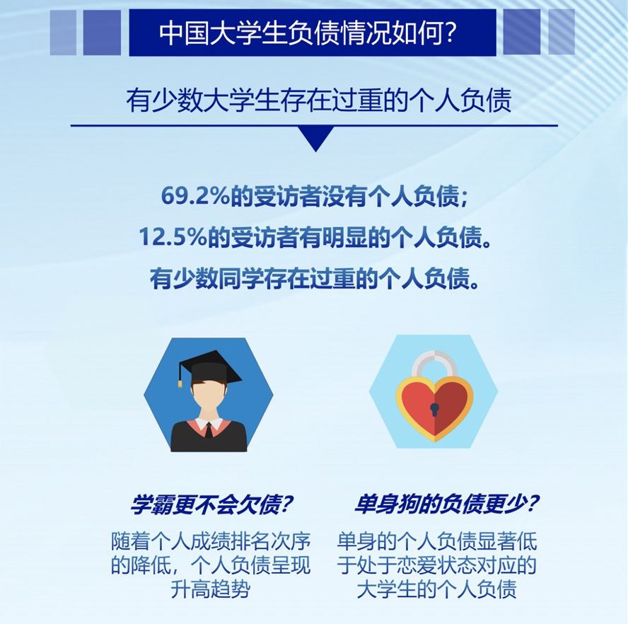 就負債情況而言,中國少數大學生存在過重的個人負債;成績越好的學生,個人負債越少;單身大學生比戀愛大學生的負債更少。