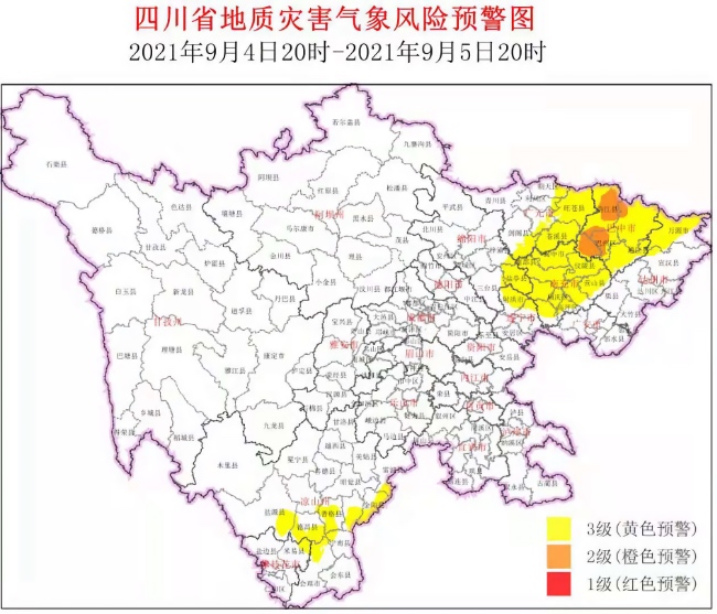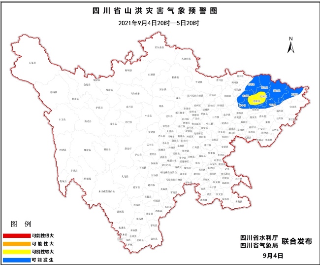 9月4日17時,四川省水利廳、四川省氣象局發布山洪災害黃色預警,4日20時至5日20時,巴州、恩陽、南江、閬中、儀隴、蒼溪等縣(市、區)發生山洪災害可能性較大(黃色);旺蒼、通江、平昌、萬源等縣(市、區)可能發生山洪災害(藍色)。