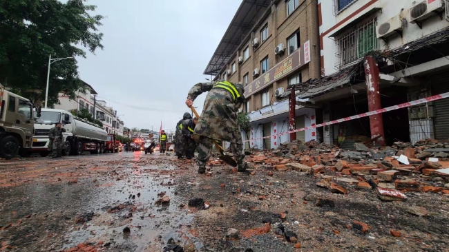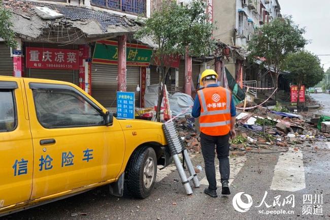 受災較重的福集鎮到處是散落的水泥磚塊,應急救援隊加緊各項搶修。人民網 朱虹攝