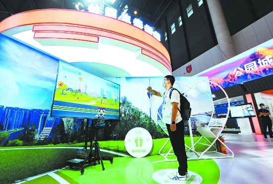 9月16日,第十八屆中國西部國際博覽會成都館的公園生態游憩展區,一位觀眾正在游戲互動區進行體驗,感受成都優美的生態環境。成都日報記者 魏麟瀟 攝影報道
