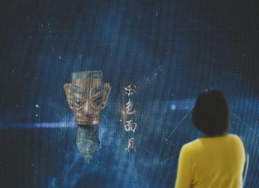 四川展館內裸眼3D呈現的三星堆金色面具讓人稱奇。