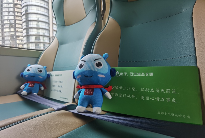 今年公交出行宣傳周期間,成都在多輛純電動新能源公交車上進行了綠色出行主題宣傳。圖為在天府機場線和部分社區定制線路上運行的新能源車輛——臉譜“二哥”。成都市交通運輸局供圖