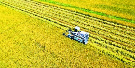 沉甸甸的稻穗掛滿梢頭,金色的稻浪隨風翻滾,無人收割機、自動打捆機在田邊整裝待發……在位于新津的天府農博園,豐收的季節已經來臨。