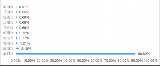 《報告》對僅根據運營者/開發者明確為四川省的應用進行分析后顯示,成都市移動應用數量位居本省第一,占總量的88.69%;其次是綿陽市,占總量的2.10%;德陽市位列第三,占總量的1.21%。此外,南充市和瀘州市移動應用數量在本省總量的分別為0.77%和0.72%,位列第四和第五。這顯示出四川省移動應用普及度較高,呈現以成都市為中心的發展趨勢。