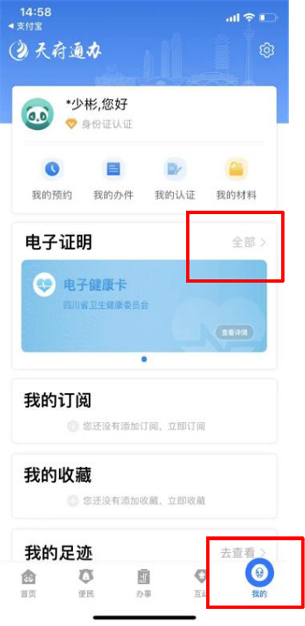 (2)選擇“我的”,“電子證照”,點擊“全部”;