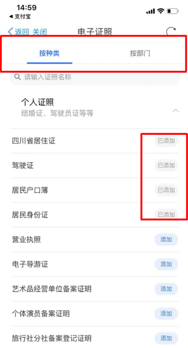(4)進入證照列表,“按種類”或“按部門”添加需要的證照;