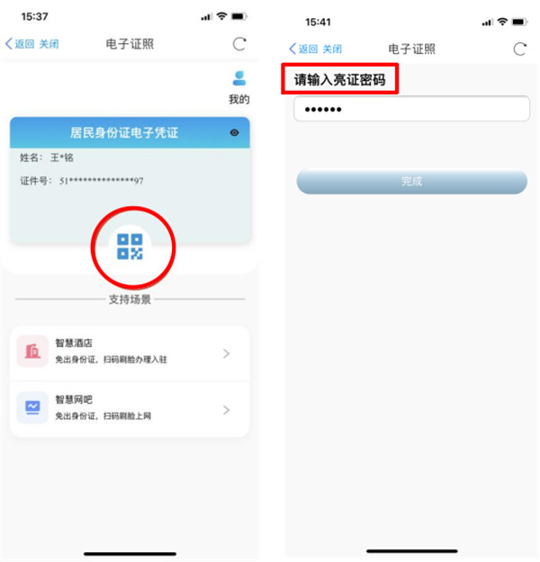 (7)人臉識別完成后返回證照列表,選擇認證完成的居民身份證;點擊圖中二維碼,輸入6位“亮證密碼”即可實現“亮證”;