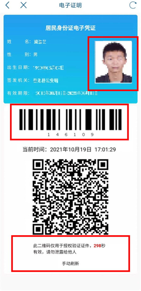 不用擔心信息外泄。電子憑證與手機硬件形成綁定,別人無法偽造、無法使用截圖(截圖無300秒時間倒計時),有效保障申領人的信息安全。