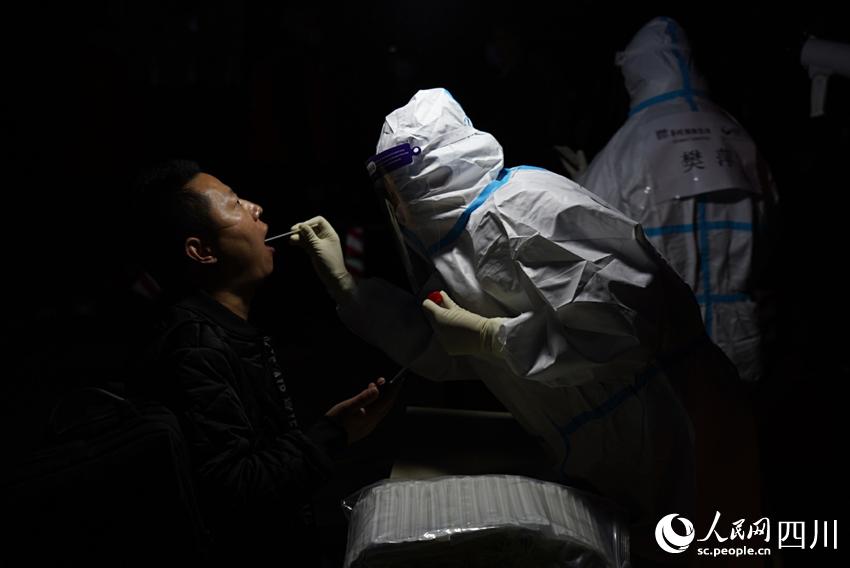 成都成華區雙福社區檢測點,一名群眾正在接受核酸檢測。人民網記者 李平攝
