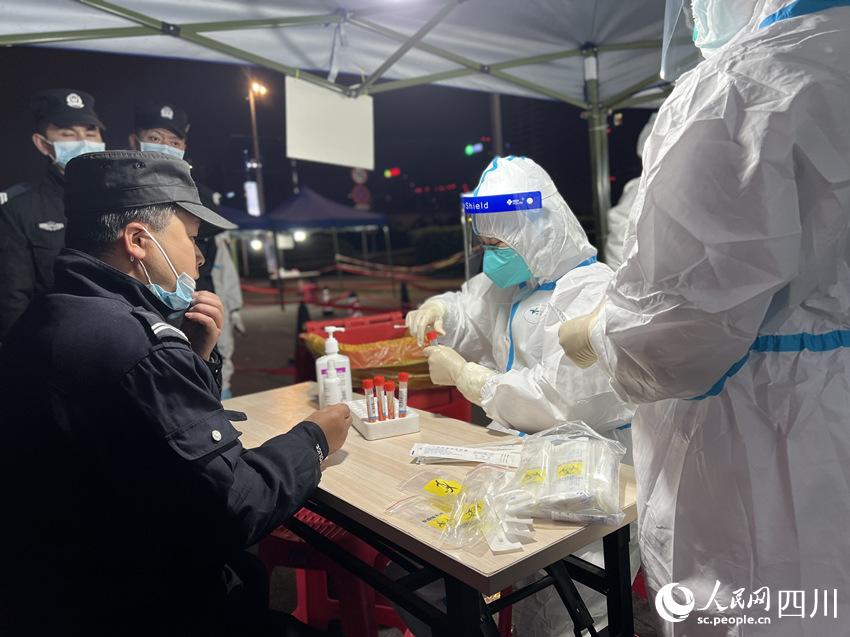 成都市高新區桂溪街道昆華社區黨委書記高琴英一直在現場忙碌著。她說:“今天下午4點左右的時候接到通知,支援環球中心的核酸檢測工作。醫護人員有從青白江來的,有從桂溪衛生服務中心借調的。到現在晚上11點了,歷時4個小時多一點,檢測了差不多4200人!