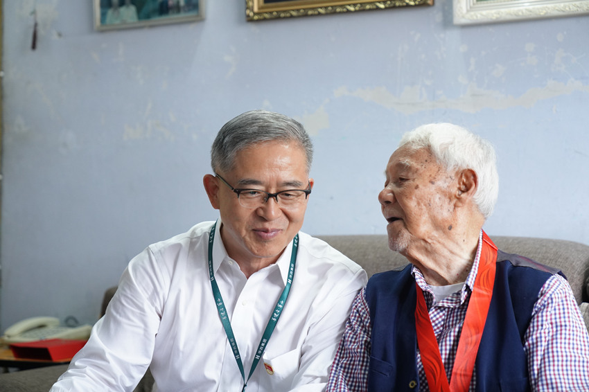 華西集團有限公司黨委書記、董事長楊斌看望集團107歲老紅軍趙世新,為他佩戴“光榮在黨50年”紀念章。華西集團供圖