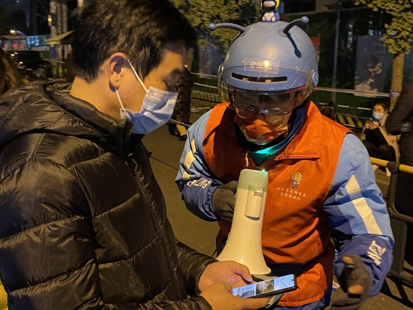 11月8日,外賣小哥趙明陽在街道核酸檢測現場,引導前來檢測的居民并維持現場秩序。街道供圖
