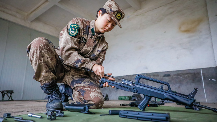 王茜茜在進行槍支分解結合訓練。陸軍第77集團軍某炮兵旅供圖