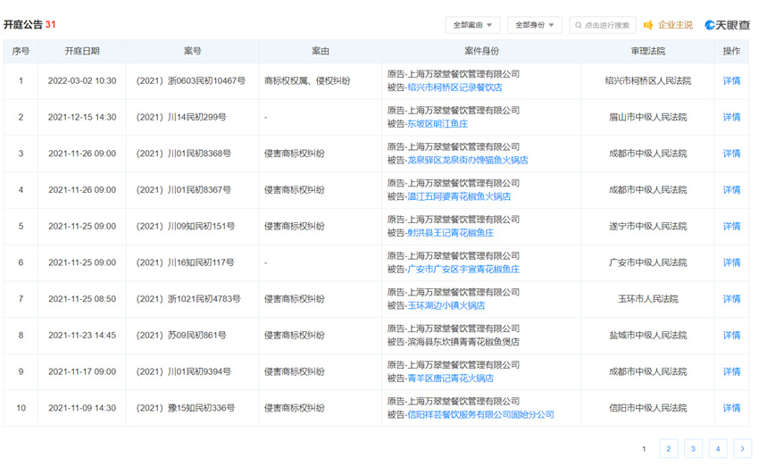 據了解,上海萬翠堂餐飲管理有限公司成立于2013年6月24日,公司位于上海市徐匯區古美路1188號6A幢三層318室,法定代表人是左正飛。同時,在天眼查發現,萬翠堂公司從2020年9月10日到2021年12月21日有立案信息10條,其中被告有四川省成都市武侯區雙合園火鍋店、青羊區唐記青花火鍋店、雙流區盧三妹青花椒魚火鍋店等,案由基本都是侵害商標權糾紛。而在法律訴訟欄,案件大部分都被原告撤訴。