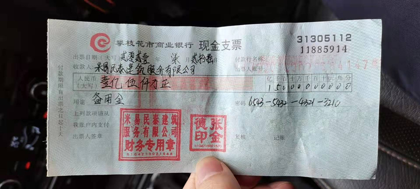 人民網成都1月15日電 (何皖鈺)“這個支票是真的,因為我老公以前就用過支票,上面公章啥的都有!睋拇ㄊ∨手ㄊ忻滓卓h警方消息,近日,米易縣公安局接到群眾報警稱,在馬路上撿到一張一億五千萬的現金支票,急需警方的幫助。米易縣公安局攀蓮派出所民警立即趕赴現場取證詢問,并根據支票所顯示信息前往銀行核對。