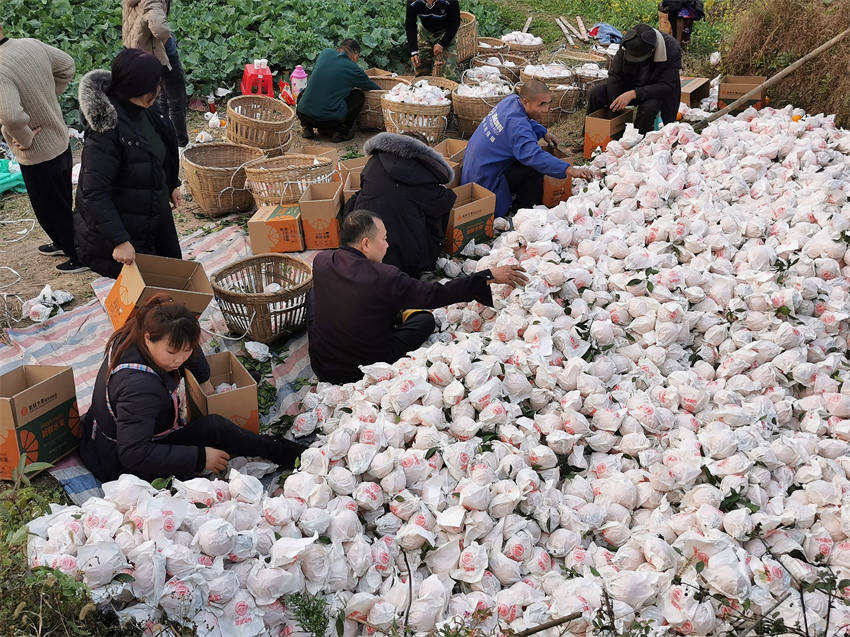 在雙石鎮武館村8組山坡上,20多個村民正在路邊忙碌,有的在選果裝箱,有的在搬運,有的在秤重量。主人家是8組的胡亨萬,他說,今天賣的不知火柑橘有1萬多斤,賣給廣州的一個老板,全部裝成10斤一件,老板運回去發給職工過年吃。