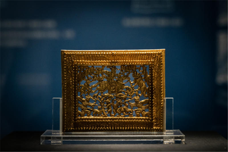 鹽池縣博物館的狩獵圖金“方奇”。其紋飾具有明顯的域外風格。狩獵武士帶有游牧民族的特征,有翼獅子是波斯阿契美尼德王朝的藝術因素,外框龍紋又是中國傳統紋飾的代表。因此,這件“方奇”成了絲綢之路上文化融合、文化交流的歷史“見證者”。張羽騰供圖