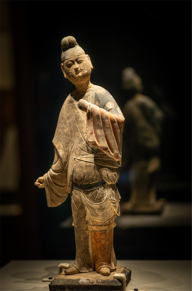 慶城縣博物館的彩繪男俑。俑裹黑幞頭,身穿黑底白花圓領內衣,外罩淺黑色右衽曳地長袍,腹部束黑色革帶,袍左下擺提起掖在革帶下,露出月白色里子和四瓣花紅綾褲,足踏白色尖頭履。陶俑圓臉豐頤,面帶微笑,左臂曲握于胸前,右臂外撇,小臂搭粉色寬袖。張羽騰供圖