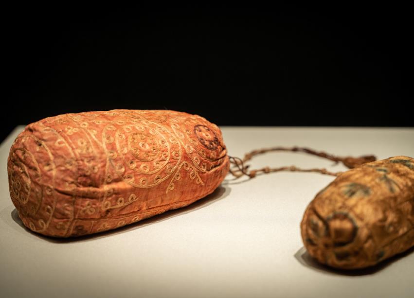 甘肅省博物館的紅地刺繡圓珠紋綾袋。張羽騰供圖