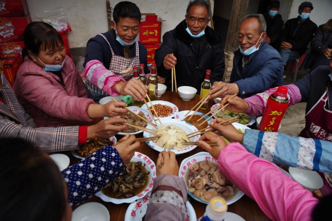 會理市岔河村村民一起品嘗九大碗。宋明供圖