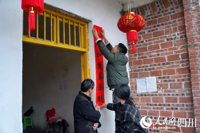 “我們代表村上來為脫貧戶劉昌友做一頓團圓飯,一起提前陪他過年!碧瀑F艷說,希望他能感受到大家庭的溫暖,不會孤單!皥F年飯”的間隙,唐貴艷和劉昌友一起在大門口掛上大紅燈籠、在大門上貼上春聯、在堂屋里貼福字,一下有了春節喜慶的氛圍。