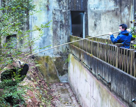 唐平貴正在給大熊貓喂食
