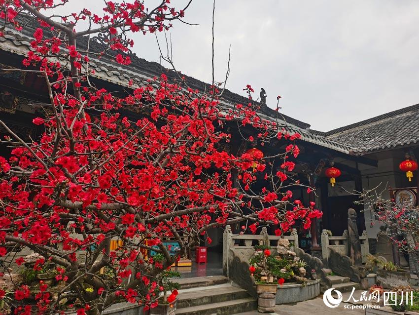 古建筑內,鮮花綻放迎春來。人民網 劉海天攝