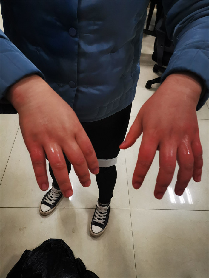朱姝姝此前通紅、腫脹的雙手。受訪者供圖