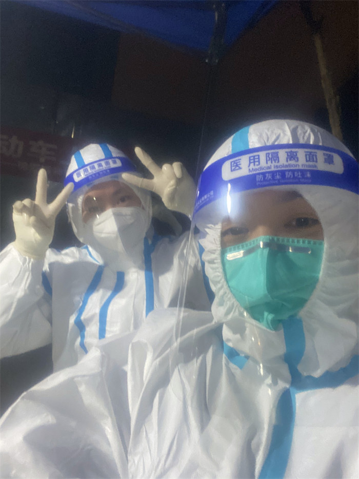 朱姝姝(前)和同事在防疫一線。受訪者供圖