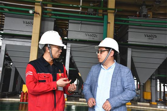 永祥新能源安全環境部部長袁旭丹(左一)向陳忠進行面對面政策咨詢。樂山市生態環境局供圖