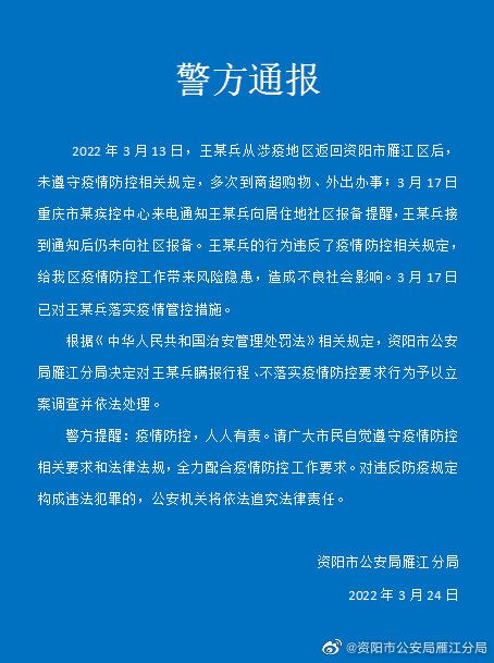 據警方通報,3月13日,王某兵從涉疫地區返回資陽雁江區后,未遵守疫情防控相關規定,多次到商超購物、外出辦事。3月17日,重慶市某疾控中心來電通知王某兵向居住地社區報備提醒,王某兵接到通知后仍未向社區報備。王某兵的行為違反了疫情防控相關規定,給雁江區疫情防控工作帶來風險隱患,造成不良社會影響。3月17日,雁江區已對王某兵落實疫情管控措施。