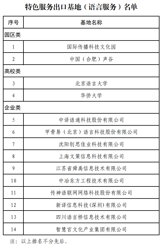 經地方申報、省市商務和相關領域主管部門初審推薦、第三方機構客觀指標評價、專家評審、部門復核和社會公示等程序,認定了:12個功能區為人力資源服務領域特色服務出口基地;9個行政區(功能區)為知識產權服務領域特色服務出口基地;5個功能區為地理信息服務領域特色服務出口基地;14家單位為語言服務領域特色服務出口基地。