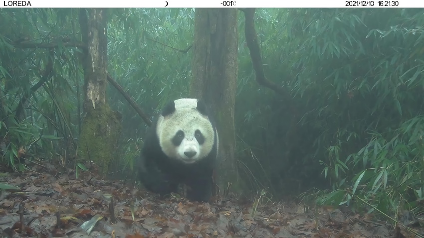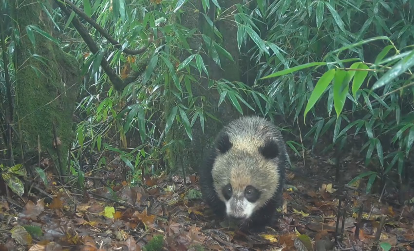 大熊貓國家公園滎經縣管護總站的紅外相機在泥巴山廊道拍攝到的大熊貓。圖片來自視頻截圖