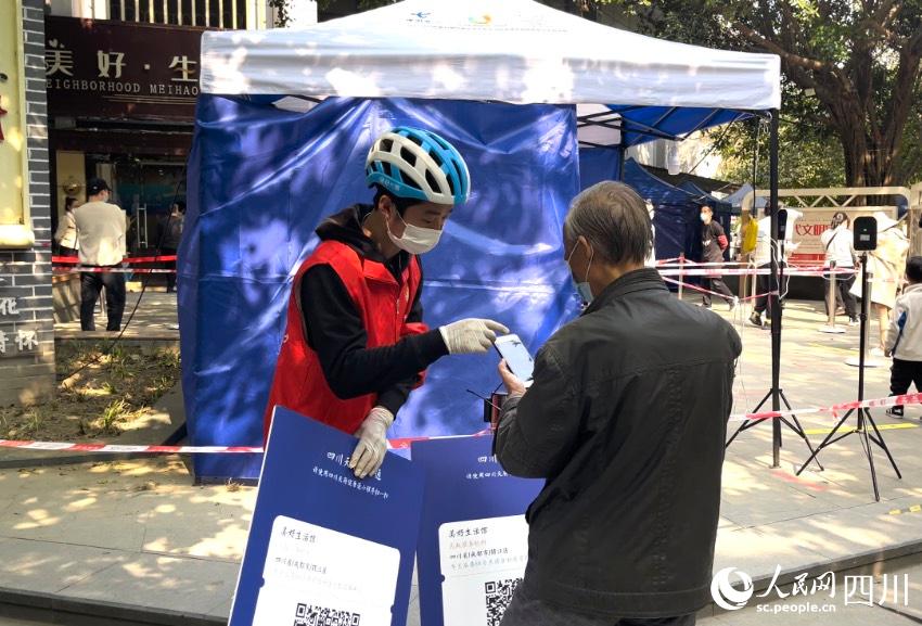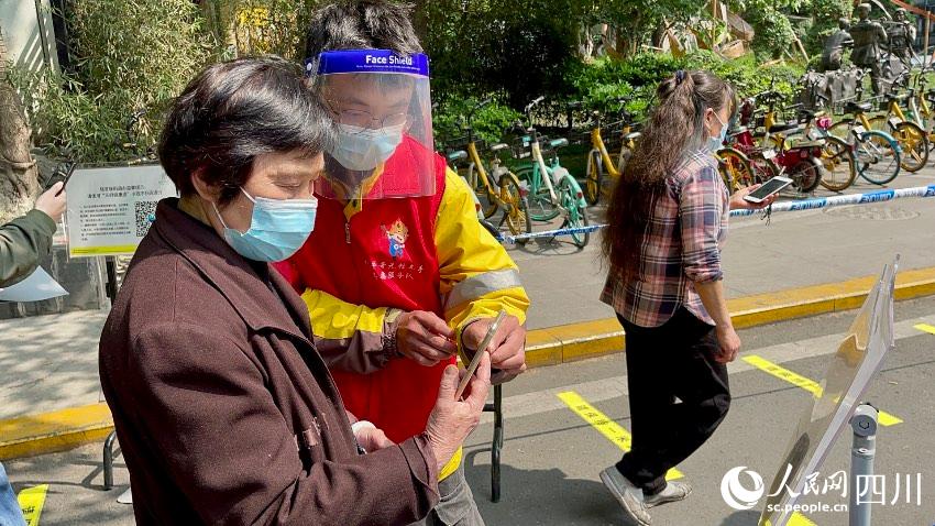 錦江區牛市口街道“小牛哥·先鋒車手”志愿服務隊隊員引導居民使用手機掃描健康碼。高林雅攝