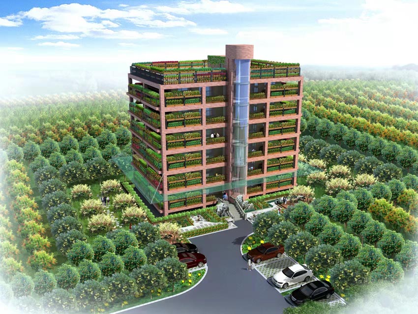 在成都市雙流區彭鎮宋家灣的新安社區里,一座新潮風格的建筑很快就要完工了。樓底下的養魚池、樓前邊的花樹椅、樓里的新式污水處理管線……都在表明著這是和傳統樓房完全不同的建筑。這是一個展示“科道模式”實際效果的建筑,每一層都是一個家庭農場,種植著時令蔬菜和水果。這個建筑在占用了一塊土地的同時,新“造”出相當于其建筑面積幾倍的土地。而且在這里,各種資源是循環利用的,綠色環保。