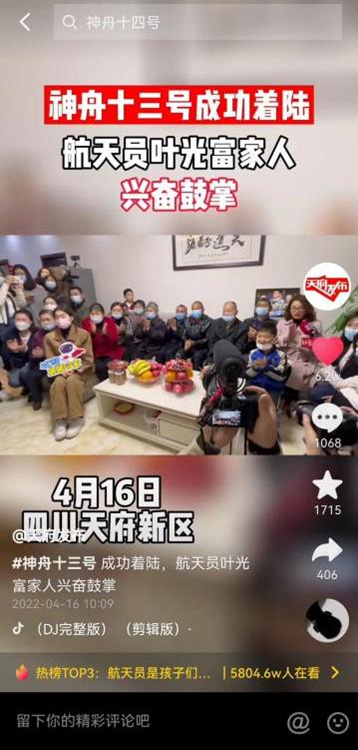 超過5800萬人關注天府發布直播神舟十三號著陸。天府新區融媒體中心供圖