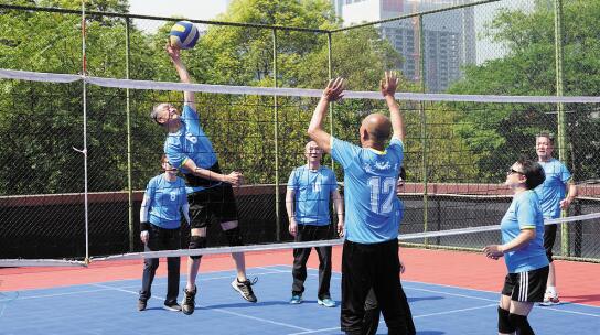 這里是石羊街道盛華社區運動角,運動角并不只是有這兩片籃球場,它的右邊有一棟綠蔭掩映的小樓。走進去,一樓的乒乓球室里,8張乒乓球桌上交手雙方正在進行激烈的比賽;二樓的排球場上,社區氣排球隊的二十多名隊員分成兩邊戰得正歡……除此之外,小樓里還配有舞蹈房、書吧、器樂室,樓間的空地還可以練習武術。