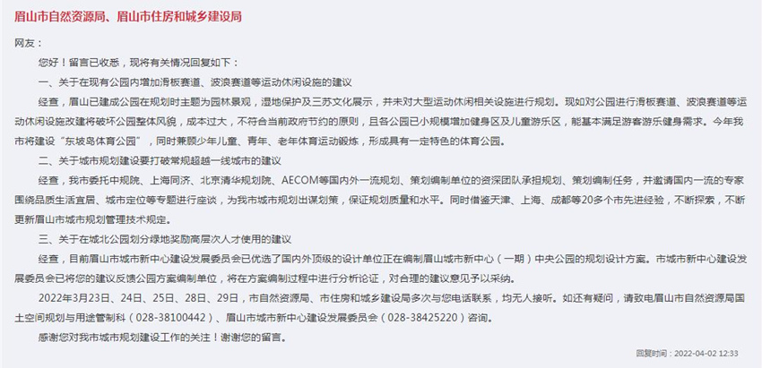 收到留言后,眉山市自然資源局、眉山市住房和城鄉建設局就該網友的建議逐條進行回復:關于在現有公園內增加滑板賽道、波浪賽道等運動休閑設施的建議,經查,眉山已建成公園在規劃時主題為園林景觀、濕地保護及三蘇文化展示,并未對大型運動休閑相關設施進行規劃,F如對公園進行滑板賽道、波浪賽道等運動休閑設施改建將破壞公園整體風貌,成本過大,不符合當前政府節約的原則,且各公園已小規模增加健身區及兒童游樂區,能基本滿足游客游樂健身需求。今年眉山市將建設“東坡島體育公園”,同時兼顧少年兒童、青年、老年體育運動鍛煉,形成具有一定特色的體育公園。