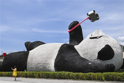 游客在都江堰仰天窩廣場大熊貓前自拍 資料圖片