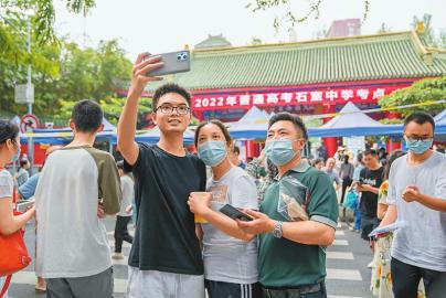 6月8日下午,在成都石室中學(文廟校區)考點外,考生和家長一起合影留念。四川日報全媒體記者 李強 攝