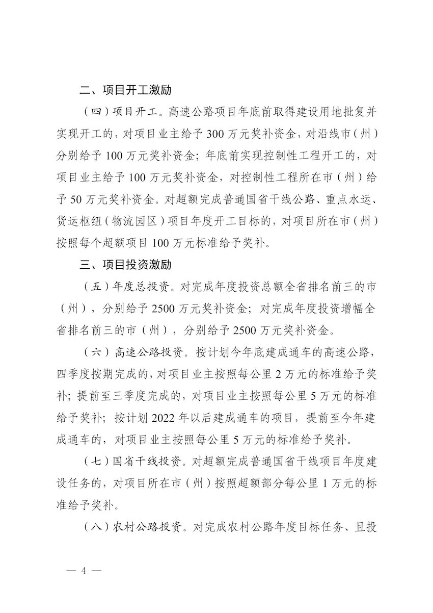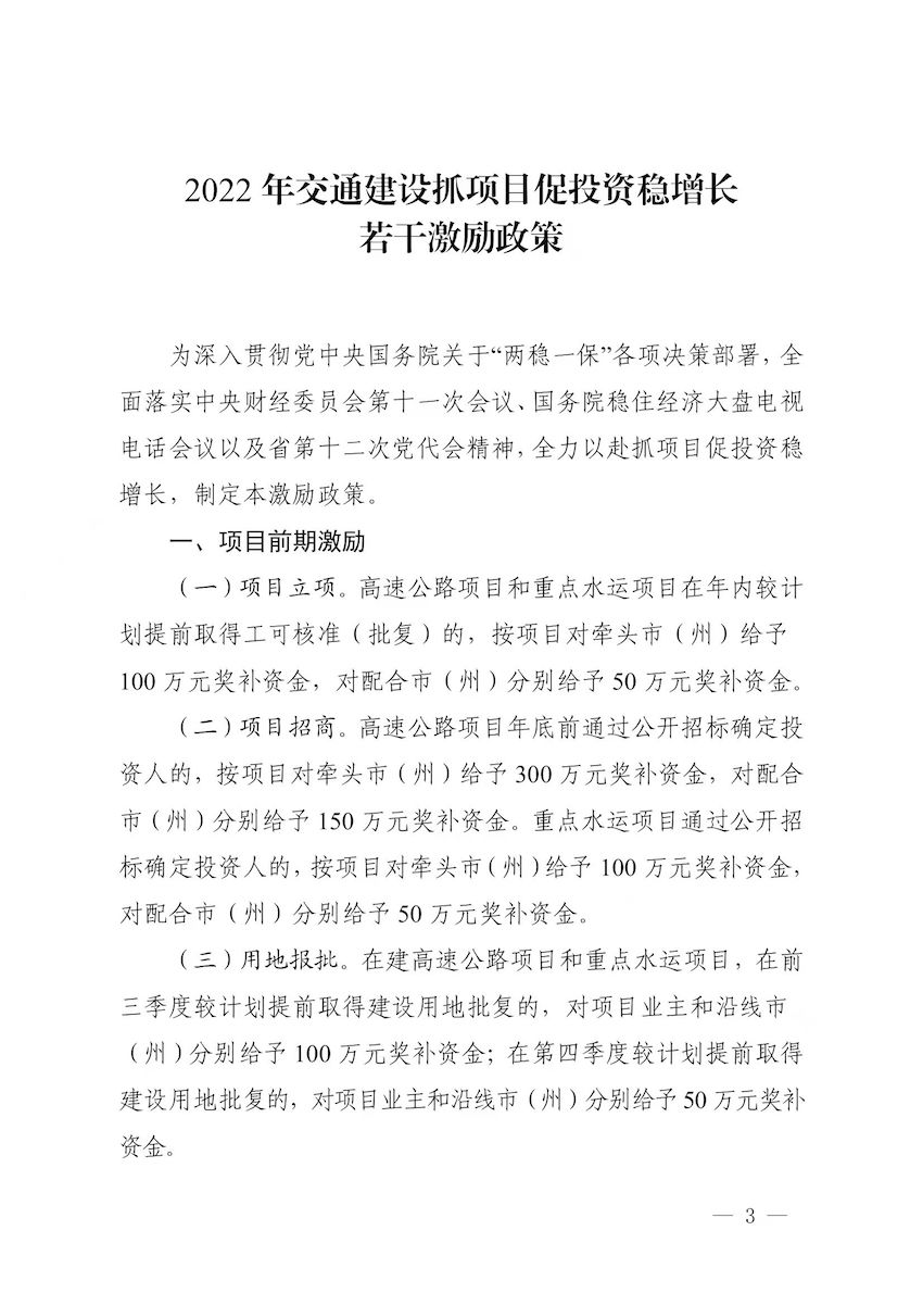 本次出臺的《激勵政策》及配套實施細則,從內容來看,涉及項目立項、招商、用地報批、開工、投資等關鍵環節,貫穿項目建設全過程,基本做到建設參與對象激勵全覆蓋。既強化了交通重點項目建設前期要素保障,又促進新項目、重點項目盡早開工建設,同時還實現了能效提升。從獎補資金的額度來看,最低50萬,最高可達2500萬,普遍在100萬—300萬之間,可謂力度空前,對各方都有很強的吸引力。
