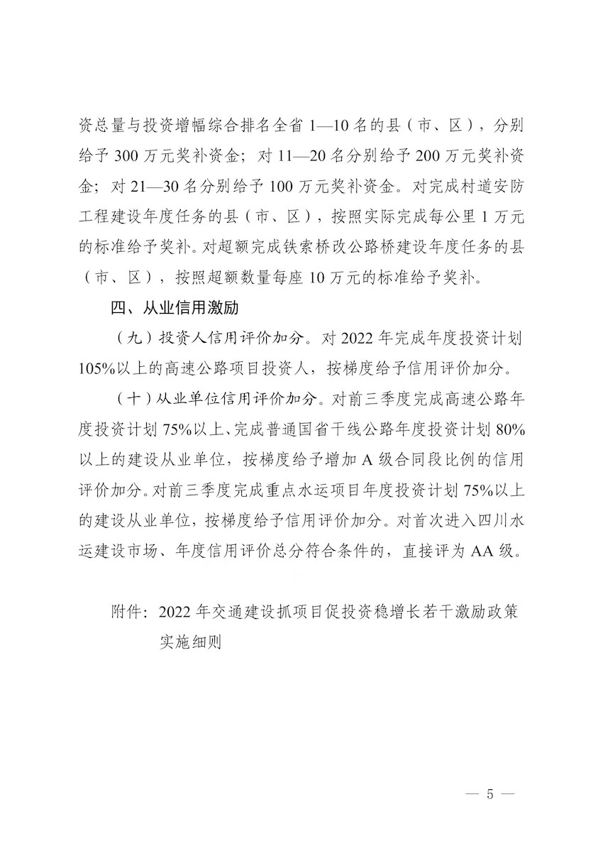 據了解,為了促進《激勵政策》落地實施,四川省交通運輸廳日前已配套制定《2022年交通建設項目促投資穩增長若干激勵政策實施細則》,一并印發,確保執行到位,執行有效。