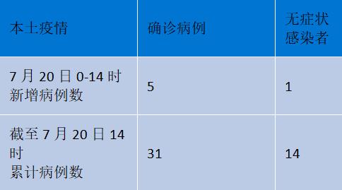 人民網成都7月20日電 (王波)據成都市衛健委消息,7月20日0-14時,成都市新增本土確診病例5例、本土無癥狀感染者1例,均在隔離管控人員中發現。截至20日14時,本起疫情累計報告本土確診病例31例、本土無癥狀感染者14例。