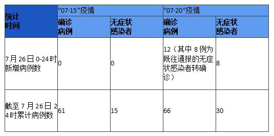 “07·20”疫情新增本土確診病例12例(其中8例為既往通報的無癥狀感染者轉確診),新增本土無癥狀感染者8例。截至26日24時,本起疫情累計報告本土確診病例66例、本土無癥狀感染者30例。