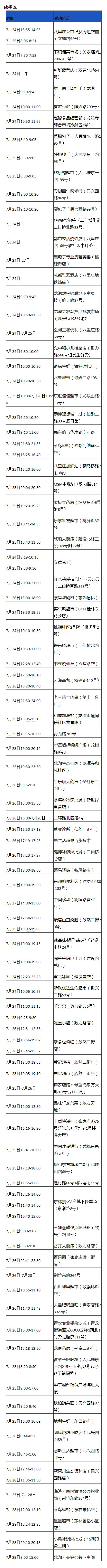 成華區(27個):府青路街道祥和苑1-5棟、7-8棟(文德路231號),府青路街道成電花園1-2棟、4棟(文德路211號),府青路街道天倫花園1棟、3棟、5-7棟(二環路東一段68號),府青路街道碧桂園中環薈1-2棟、4棟(含底商),府青路街道瀚林花園1-19棟、21-25棟(二環路東一段28號),龍潭街道龍錦雅苑1-11棟、13-15棟(含底商)(華彩路16號),龍潭街道東方麗苑1棟、3-7棟(含底商)(成宏路1號),青龍街道領地·海納時代1-6棟(含底商)(致力路566號),猛追灣街道高地1-7棟(含底商)(建設南路15號),府青路街道明信花園1-7棟(含底商)(桃源街40號),府青路街道成都·東方明珠花園西區(含底商)(建設北路三段11號),二仙橋街道民興苑2-8棟(含底商)(人民塘東二路39號),府青路街道蓉府尚座1棟、3-5棟(新風路330號),龍潭街道上東國際1棟、3棟(含底商)(龍樹路1號),二仙橋街道晴和苑1-4棟、6-8棟(建設北路三段496號),二仙橋街道泰博理想城二期2-4棟(含底商)(仙韻巷66號),跳蹬河街道龍湖三千城1期3棟,龍潭街道叢樹家園1棟,二仙橋街道機車廠宿舍71棟,龍潭街道北湖印象3期1-7棟、9-15棟(含底商)(同樂社區同樂巷),跳蹬河街道紅楓嶺三期7棟(建設南路160號),跳蹬河街道朗詩萃樾(含一樓售樓部)(新風路246號),府青路街道祥和苑6棟(文德路231號),府青路街道錦繡上城1棟(桃華街88號),龍潭街道龍錦雅苑12棟(華彩路16號),保和街道東匯家園3棟(龍泉山路111號),府青路街道博聞·時代錦匯華庭(含底商)(雙建路45號)