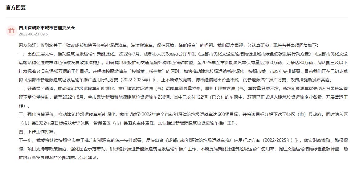 收到留言后,成都市城市管理委員會高度重視,經認真研究,進行了詳細回復。據回復,成都已從三個方面采取措施,推動建筑垃圾運輸車新能源化,具體如下: