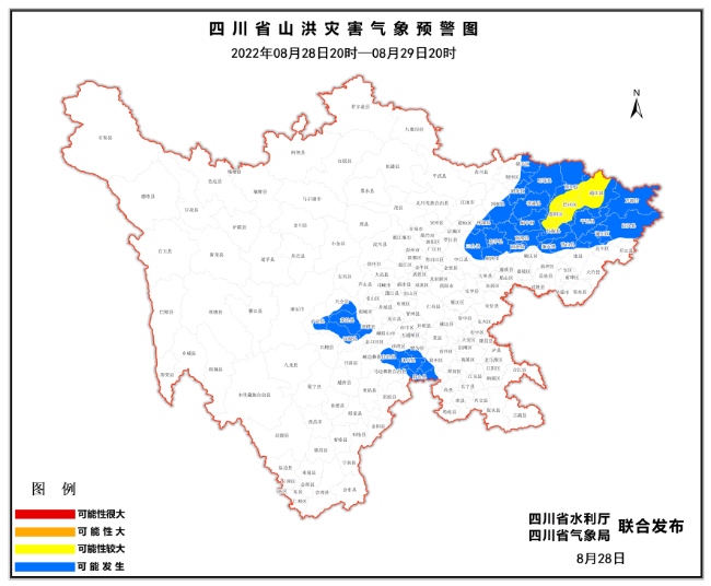 預警顯示,8月28日20時至29日20時,南江、通江、巴 州、恩陽、儀隴等縣(市、區)發生山洪災害可能性較大(黃色);萬源、宣漢、通川、達川、平昌、渠縣、營山、蓬安、南部、西充、閬中、旺蒼、蒼溪、朝天、利州、昭化、劍閣、 梓潼、鹽亭、三臺、射洪、屏山、敘州、犍為、沐川、馬邊、 峨邊、漢源、滎經、天全、洪雅、瀘定等縣(市、區)可能發生山洪災害(藍色)。