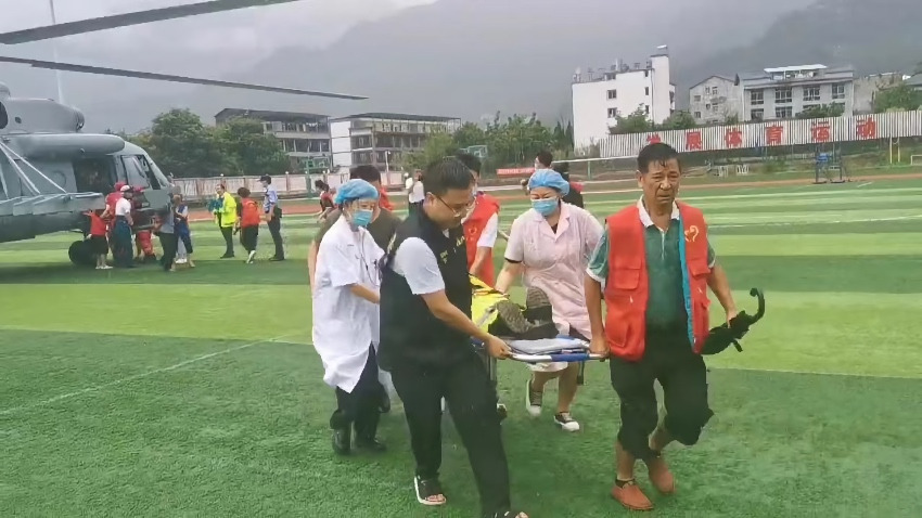 救援直升機緊急馳援綿陽市平武縣,轉移受災群眾。視頻截圖