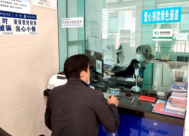 客戶通過人臉識別系統在建行甘孜分行營業網點“抗震救災綠色通道”辦理業務。建行四川省分行供圖